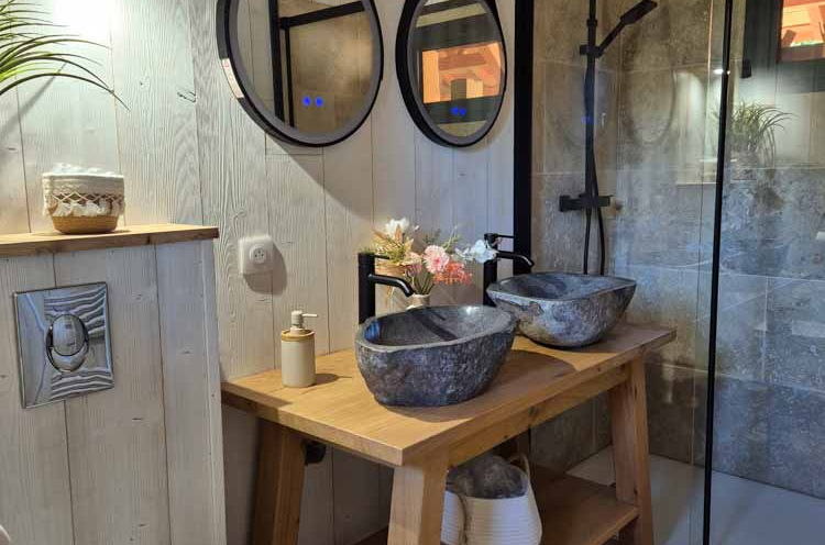 Salle de bain séparée avec douche à l’italienne, double vasque, WC, sèche-cheveux