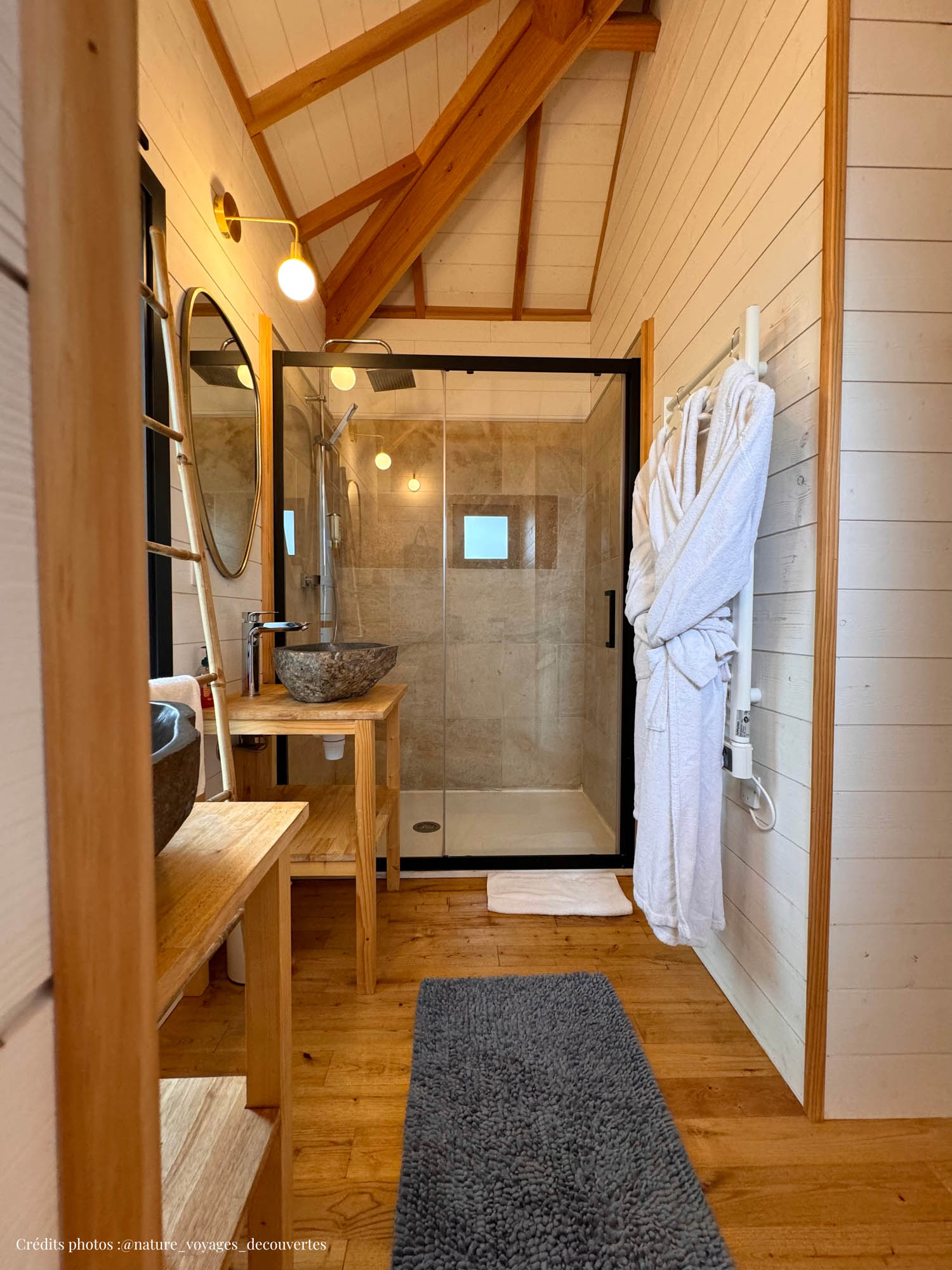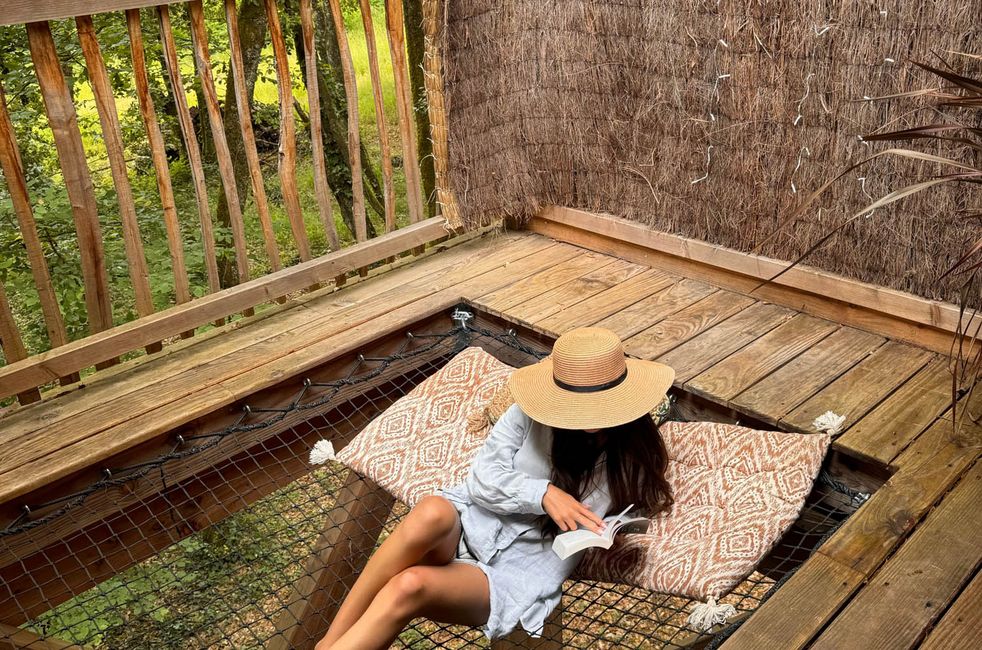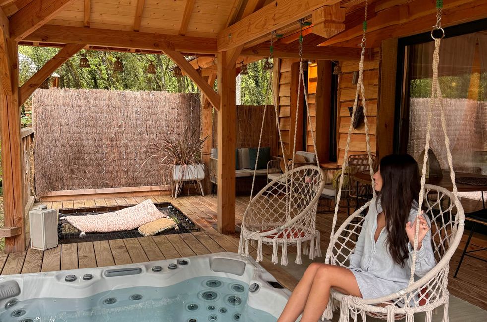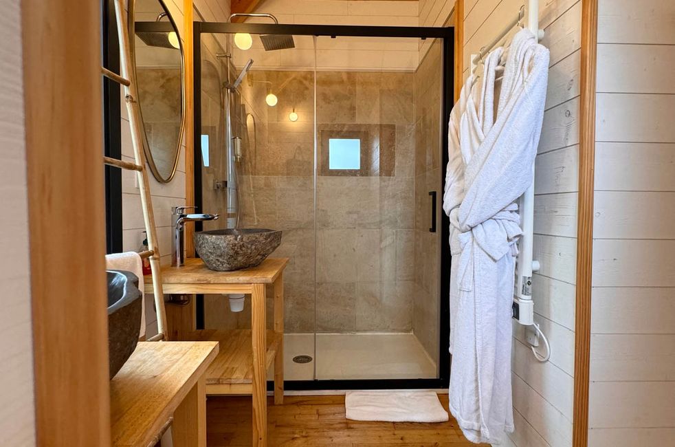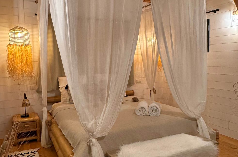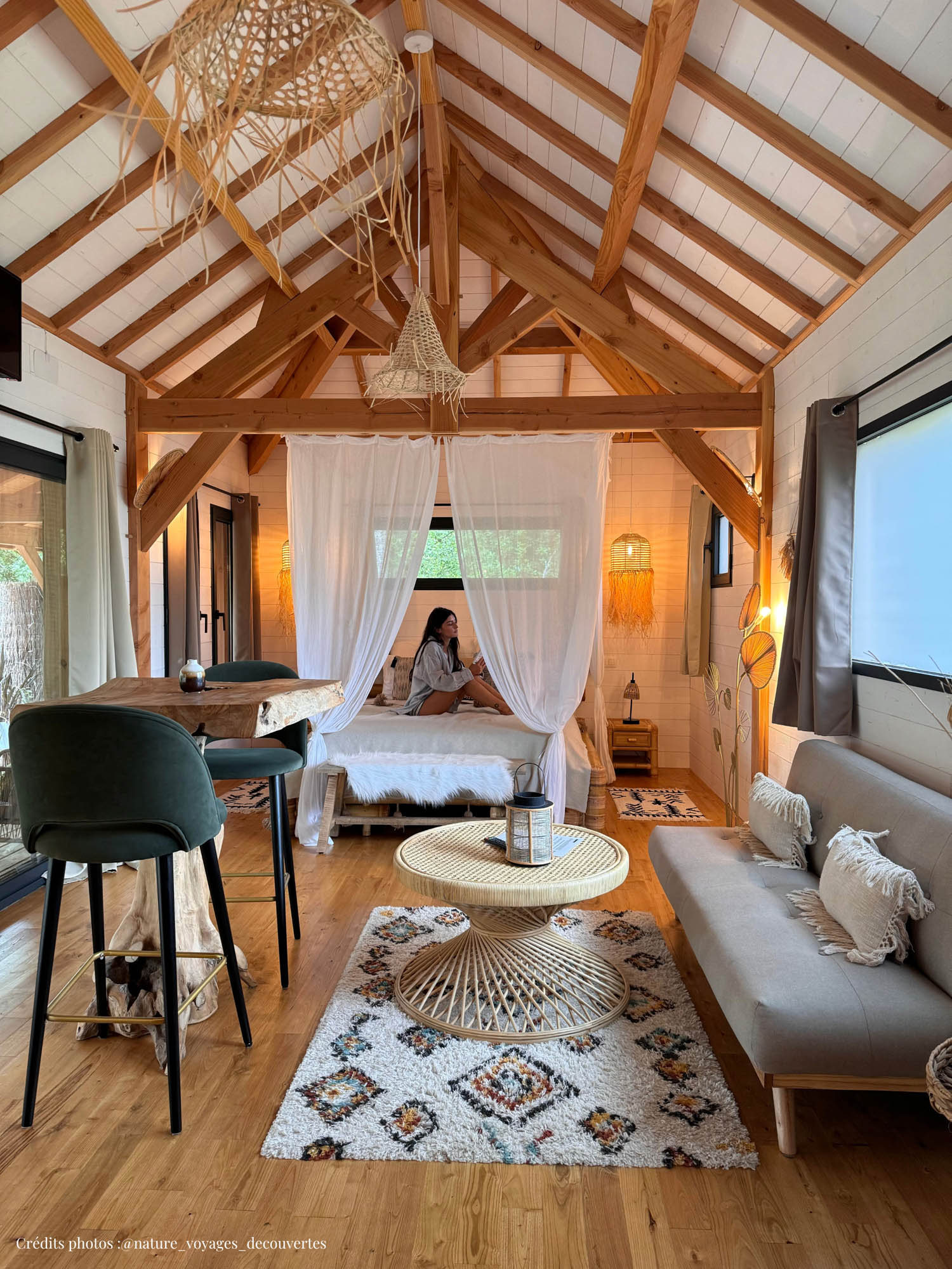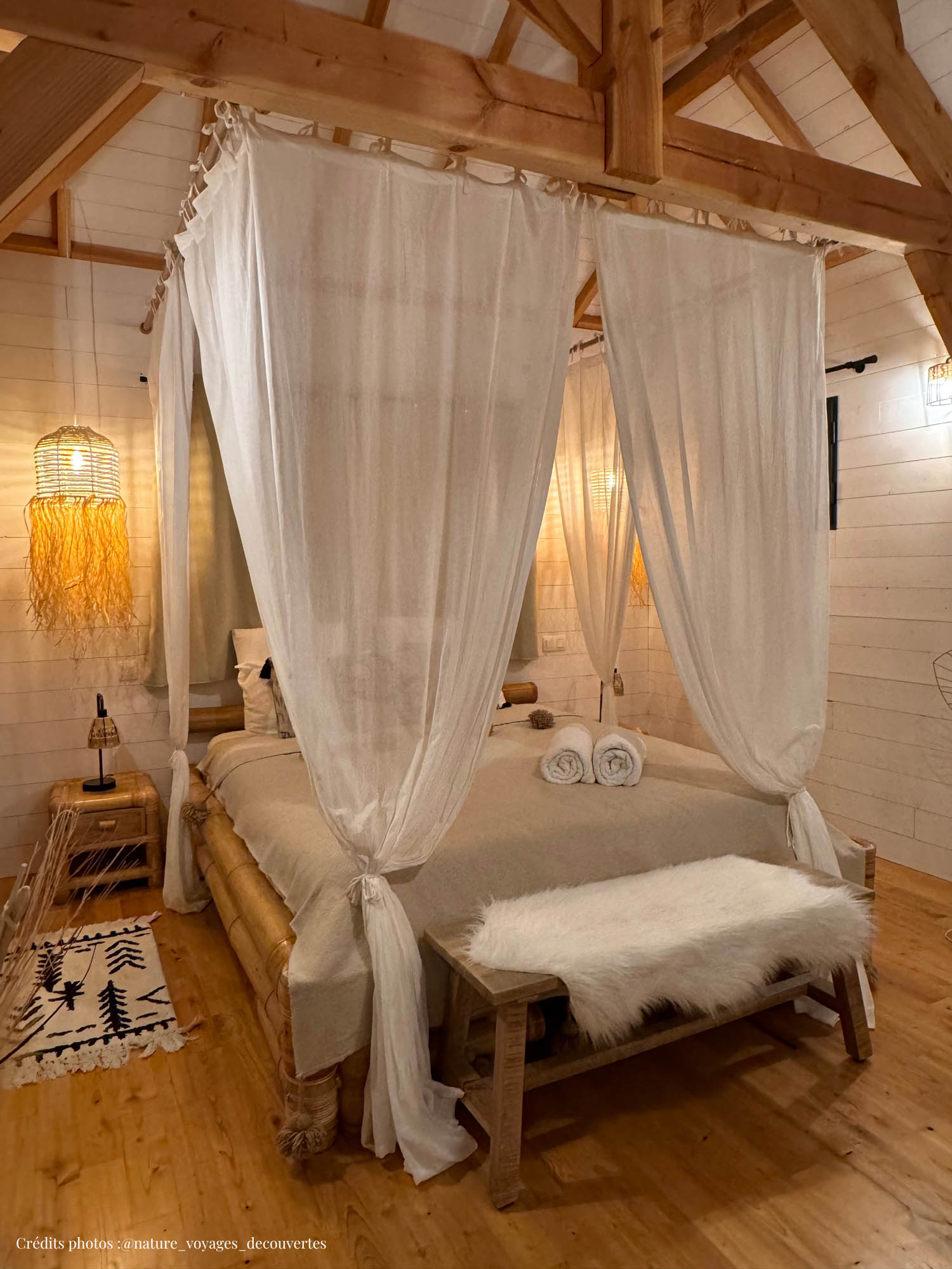 Enjoy the fully glazed sauna and the west orientation, immersed in the trees and facing the meadow. The bamboo bed imported from Bali is adorned with romantic curtains.