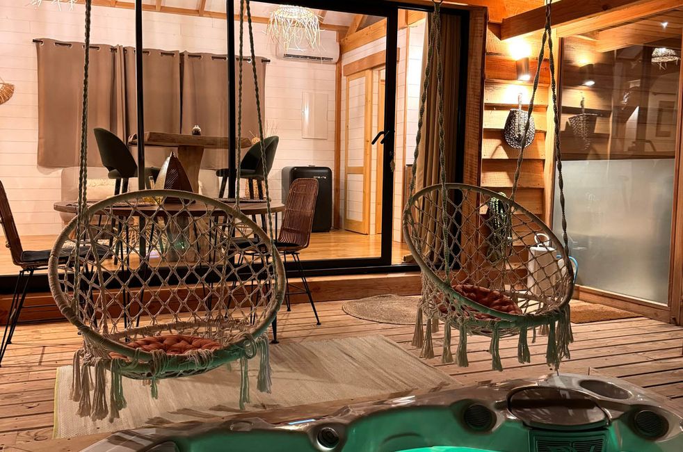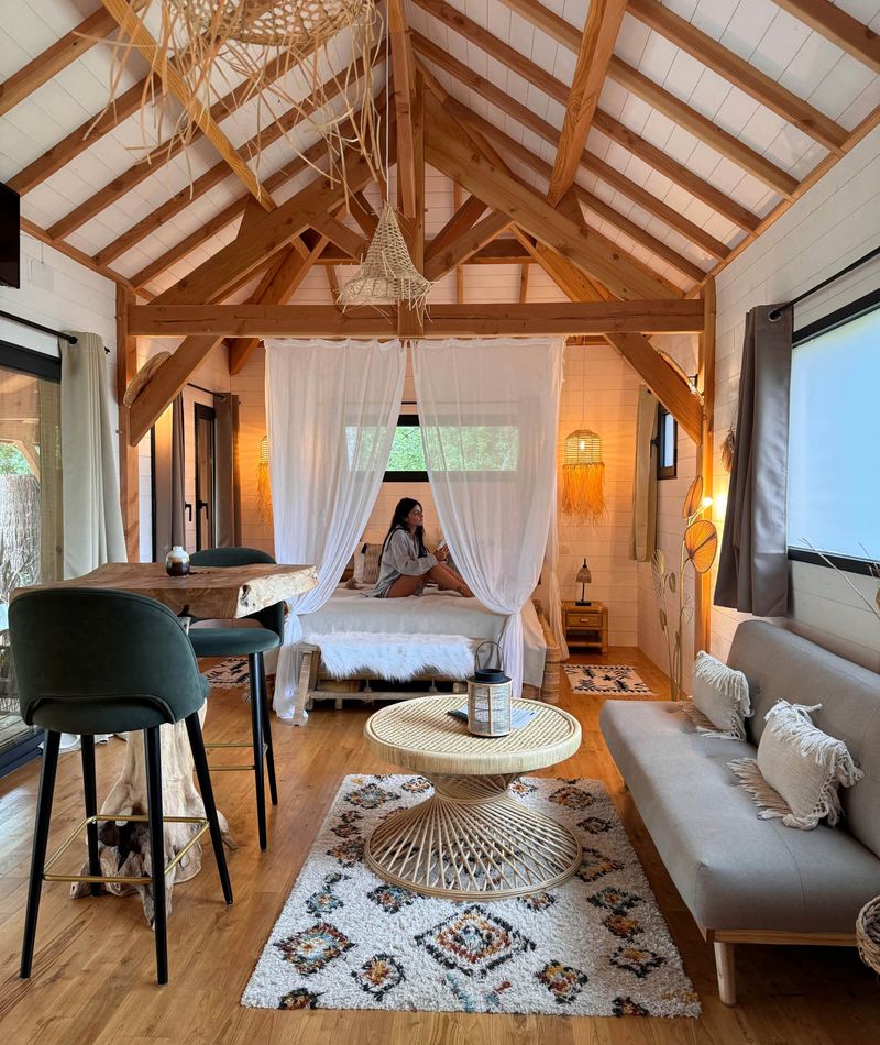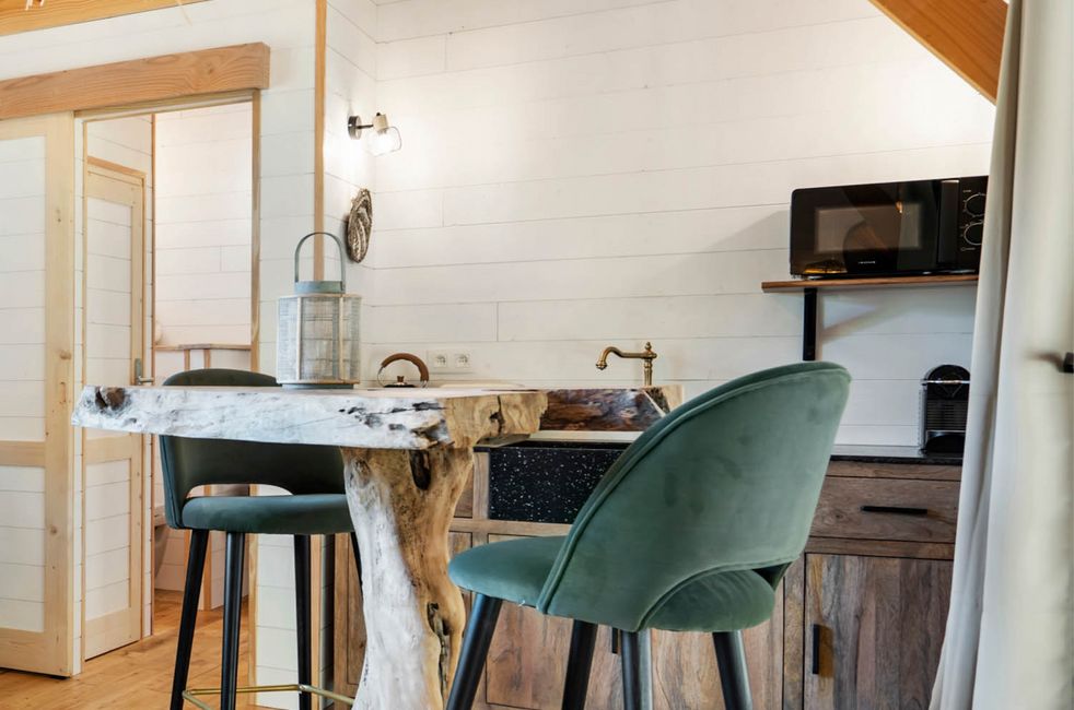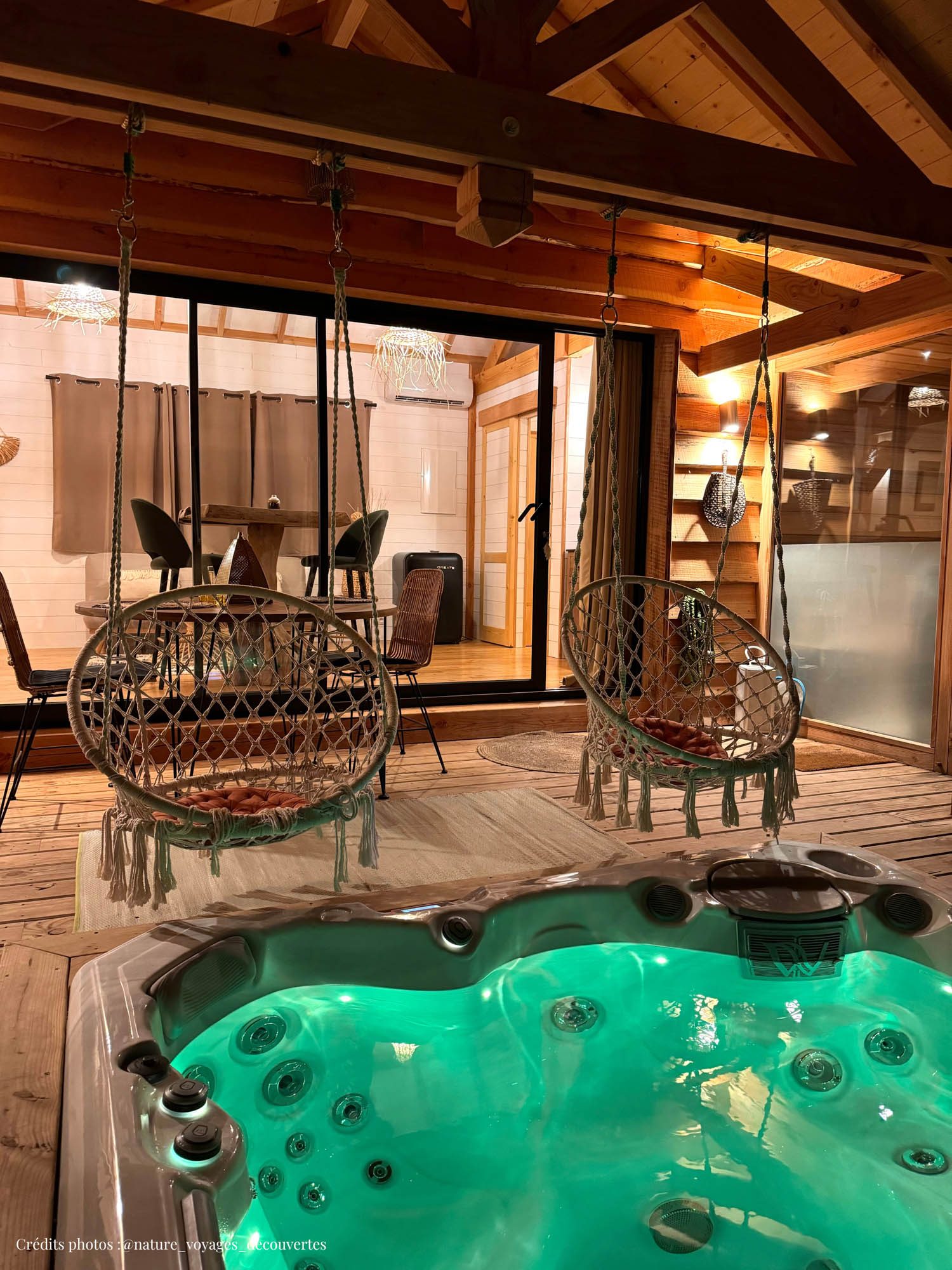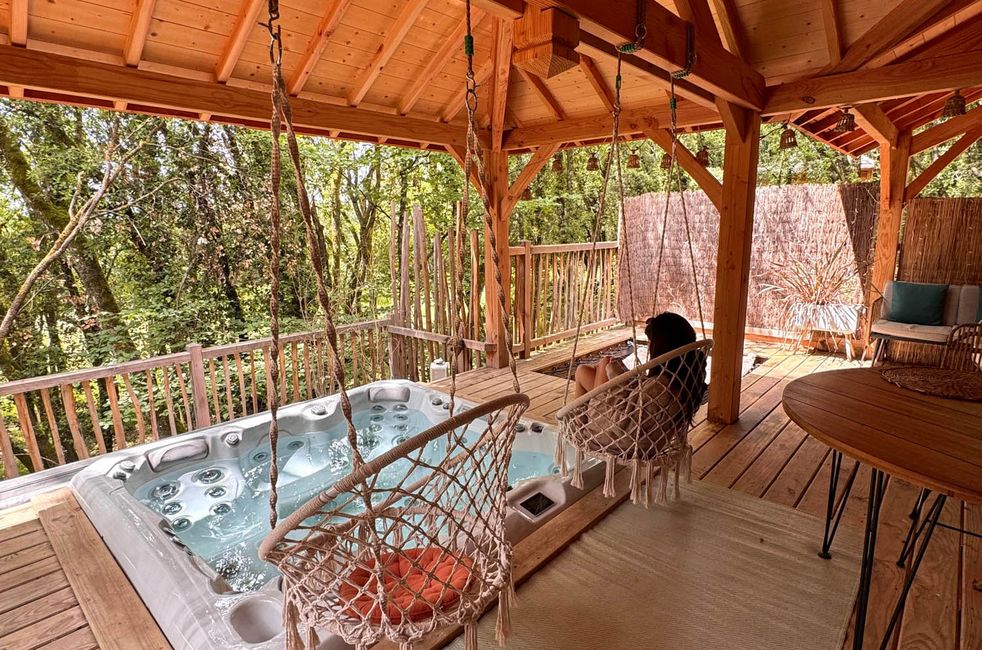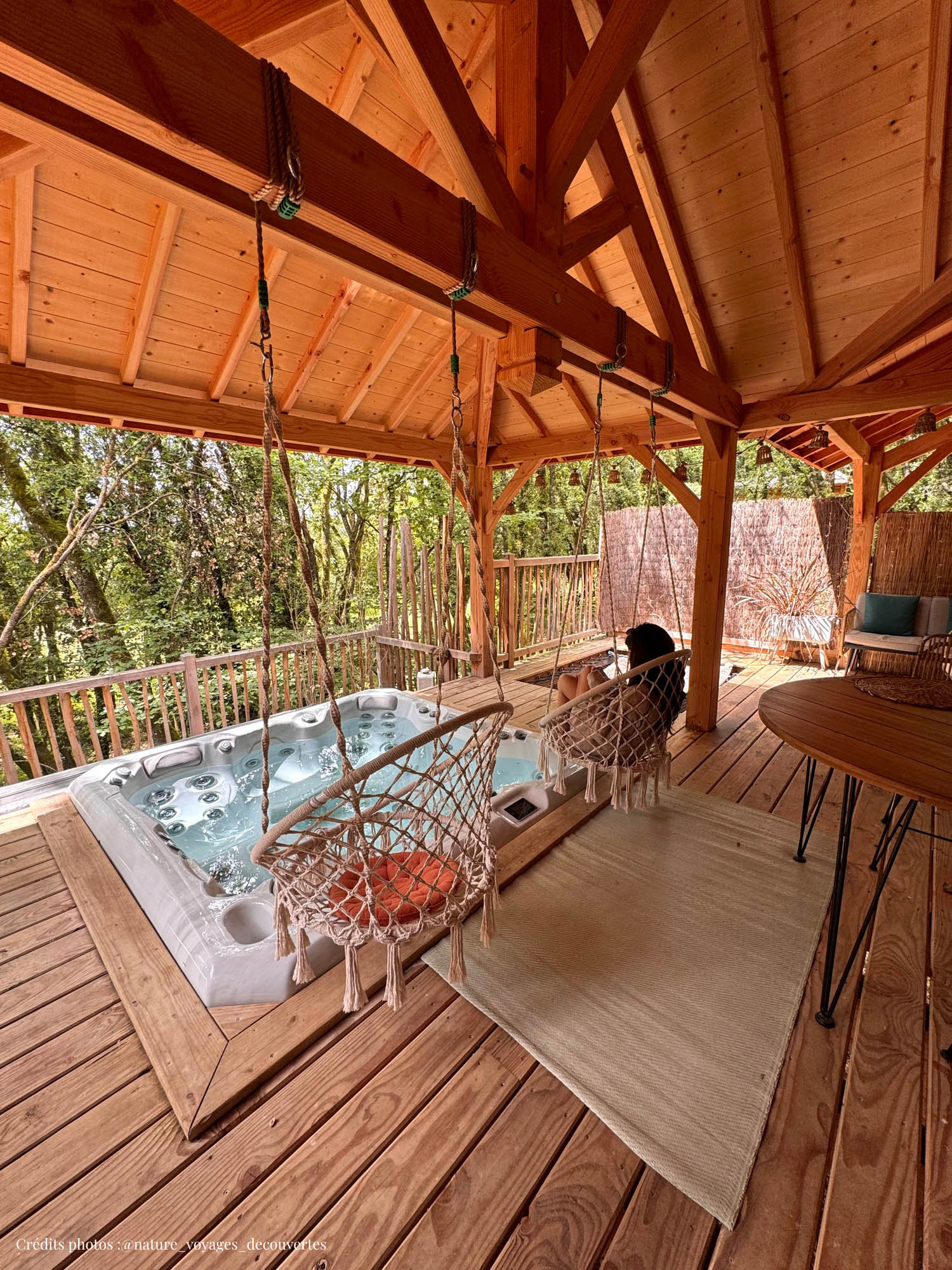 Enjoy the fully glazed sauna and the west orientation, immersed in the trees and facing the meadow. The bamboo bed imported from Bali is adorned with romantic curtains.