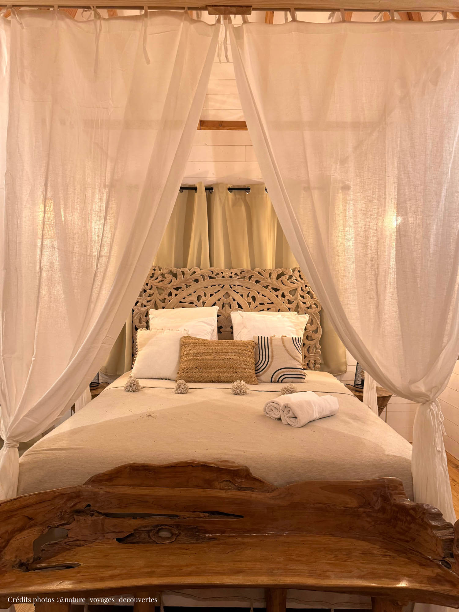 Lie down in the suspended net to sunbathe or contemplate the stars! Enjoy the pure decoration with the carved headboard and one-piece bench in solid wood.